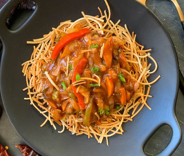 Crispy fried noodles served with a tangy-sweet vegetable gravy—this fusion dish is crunchy, saucy, and satisfying.