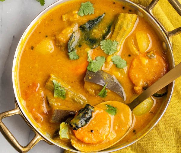 This tangy lentil stew made with toor dal, tamarind, and vegetables is the backbone of South Indian meals. It’s seasoned with a rich tadka of mustard, dry red chilies, and curry leaves.